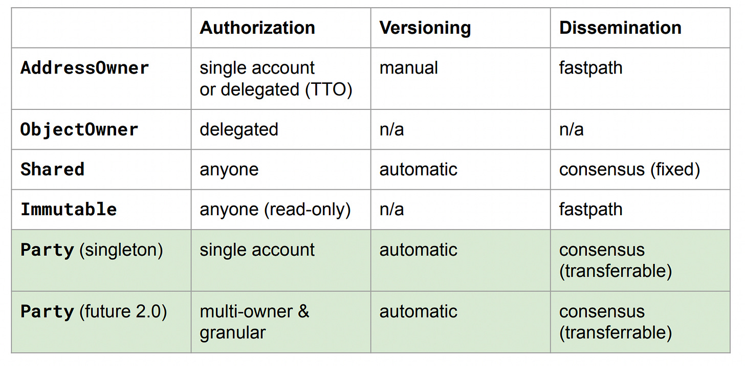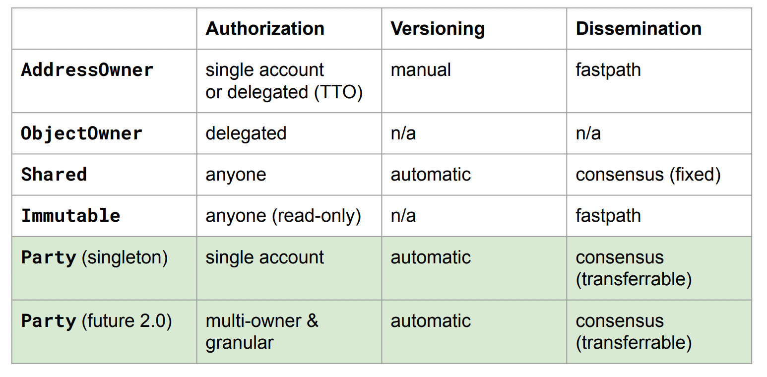 AddressOwner: one accountObjectOwner: delegated to another objectShared: anyoneImmutable: anyone can read, nobody can change